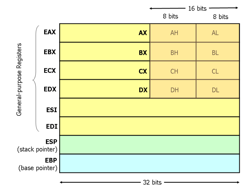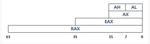 RAX(64 bits) - EAX(32 bits, Extended AX) - AX(16 bits) - AL(8 bits) - AH(8 bits)