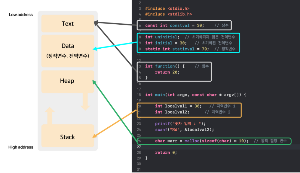 상수, 함수는 text 영역 / 전역, 정적 변수는 data 영역 / 지역 변수들은 stack 영역에 동적할당이 되는 변수들은 heap 영역에 위치하는 것을 사진에서 볼 수가 있다.